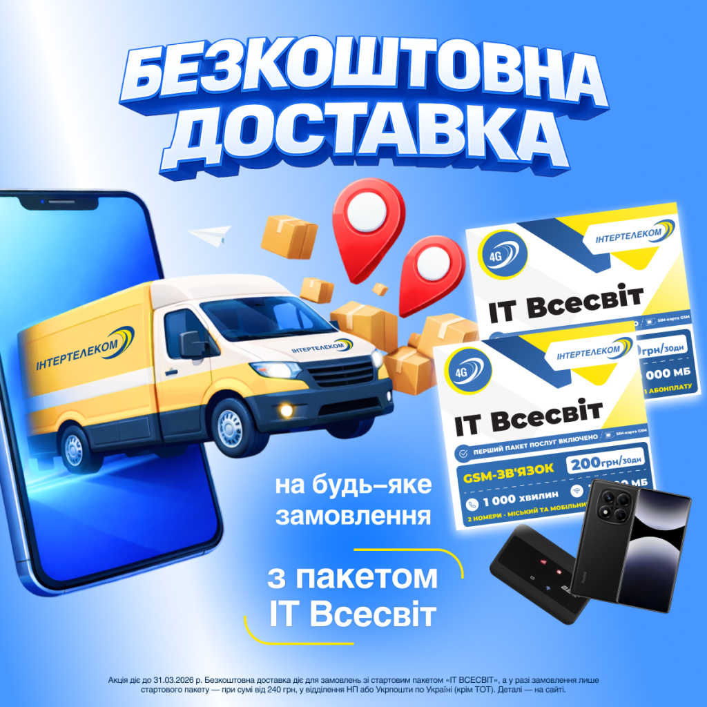 Акція діє з 20.01.2026 року до 31.03.2026 року включно для замовлень, оформлених в інтернет-магазині IT Market, у складі яких є стартовий пакет «ІТ Всесвіт» від Інтертелеком за умови повної передоплати замовлення по всій території України у відділення Нової пошти або Укрпошти.