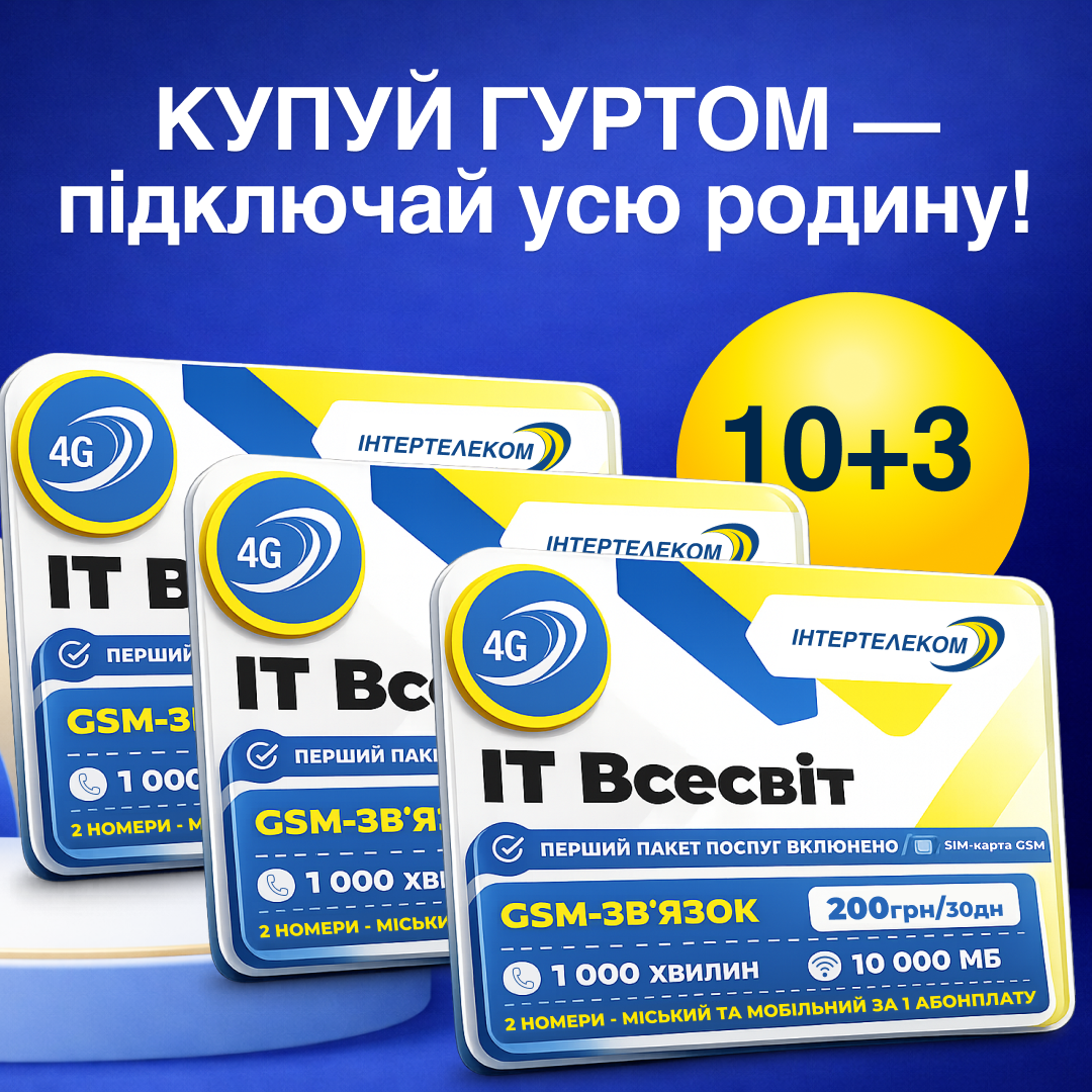 Набір стартових пакетів 10+3 — це практичне рішення для тих, кому потрібно більше номерів та вигідніша ціна за SIM-карту. У комплект входить 13 стартових пакетів, з яких 3 надаються безкоштовно.